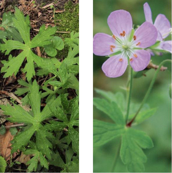 Wild Geraniums have pink, white or purple, 5-petalled flowers. Their distinct leaves have 5 deep-cut lobes. Wild geraniums typically flower in early spring. The beautiful flowers attract bees and bird pollinators. To learn more about wild geraniums, visit: